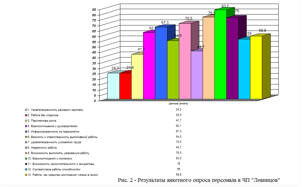 И третьим, довольно важным аспектом для большинства опрошенных сотрудников предприятия ЧП «Левинцов», стал факт работы в стрессовых ситуациях и с большим нервным напряжением. И в данной ситуации, необходимо проведение различных психологических тренингов, направленных на снятие стресса и нервного напряжения, также возможно оборудование кабинета психологической разгрузки или, как минимум, оборудование спортзала, что также значительно повысит работоспособность и активность персонала предприятия ЧП «Левинцов».