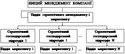 Управління поділяється між стратегічними господарськими підрозділами, кожне з яких відповідає за досягнення цілей у певному бізнесі. Система управління поділена на два рівня: перший – вищий менеджмент (вирішує маркетингові питання регулювання і координації бізнес-портфеля і виробляє стратегічні рішення для компанії в цілому), другий – відділ стратегічного менеджменту і маркетингу (має декілька стратегічних господарських підрозділів, кожне з яких, у свою чергу, покликане розробляти і реалізувати маркетингову програму для конкретного товару, ринку, споживача) (рис. 1.9) |