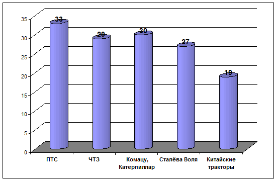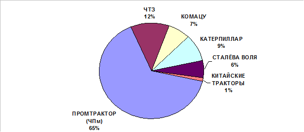 3) В последние годы на рынок тяжелых тракторов, кроме привычных конкурентов (Комацу, Катерпиллер, Сталёва Воля)), активно внедряются китайские производители. Трудность борьбы с ними заключается в том, что при качестве их техники на порядок ниже качества техники ОАО «Промтрактор», цена предложения на китайские тракторы ниже на 2 порядка. Также необходимо учитывать, что китайские производители ведут массированную экспансию, особенно на приграничных территориях