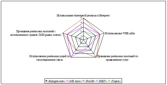 5. Предприятие «KALNGALE AUTO» не осуществляет целенаправленного планирования по использованию средств рекламы в своей маркетинговой деятельности, но правильный и продуманный выбор каналов коммуникации, позитивно повлияет на конкурентоспособность, повышение имиджа, привлечения новых клиентов и эффективности продвижения своих товаров и услуг на рынке.