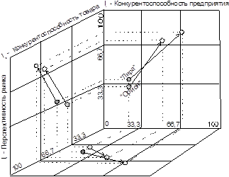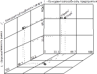 В дальнейшем рассмотрим положение этих двух фирм на матрице конкурентности бизнеса (МКБ) и после реализации выполненных мероприятий в координатах конечных индексов (рис. 5.).