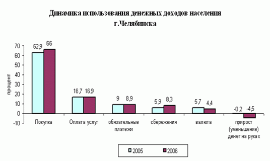 Как сообщили ИА REGNUM в пресс-службе Министерства экономического развития Челябинской области, доля денежных доходов (рис.1) использованных населением на покупку товаров и оплату услуг, составила 82,9%,что по сравнению с прошлым годом больше на 3,7 %, из них на покупку товаров – 66,0%, на оплату услуг - 16,9%., В структуре потребительских расходов по сравнению с соответствующим периодом 2006 года увеличился объем расходов населения не только на питание (с 23,1% до 25,9%), но и на непродовольственные товары (с 27,7% до 29,1%), что свидетельствует о росте благосостояния населения. За четыре месяца 2005 года к аналогичному периоду прошлого года увеличился объем средств, направленных на покупку недвижимости - на 39,5%, на покупку валюты - на 4,3%, обязательные платежи - на 25,3%.