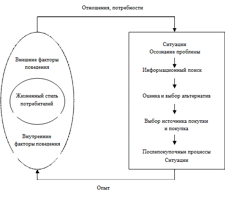 стремление сохранить или улучшить свой жизненный стиль формирует отношения и потребности потребителя. В определенной ситуации потребитель осознает проблему (необходимость или возможность улучшения или поддержки своего жизненного стиля), тем самым запускается процесс решения о покупке.Процесс принятия решений потребителя рассматривается, как правило, в составе следующих этапов: осознание потребителем наличия проблемы, информационный поиск, оценка и выбор альтернатив покупки, покупка, использование покупки и оценка решения. Факторы потребительского поведения делятся на внешние (социальные), т.е. представляющие преимущественно внешнее воздействие на потребителя, и внутренние (психологические).