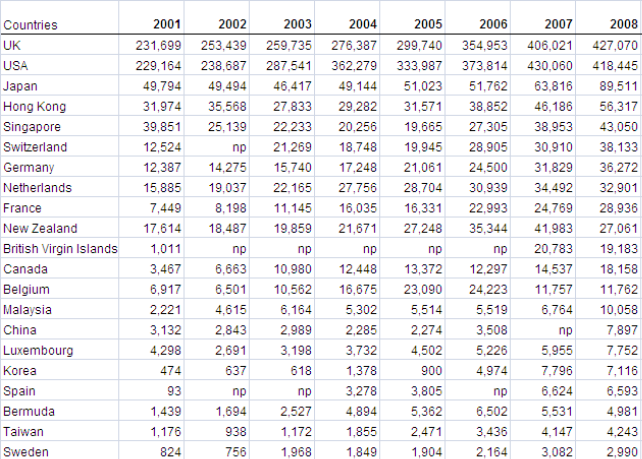 : Australian Bureau of Statistics, 2009, Australia's foreign investment relationship with partner countries, Table 2: Inward Total Investment Stock by Source Countries