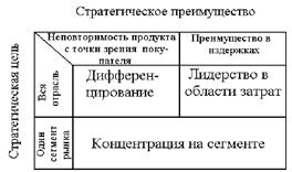 Стратегия также определяет, какие задачи должны быть решены и таким образом, определяет, что должен делать и чего достичь управленческий персонал. Стратегия определяет, какие результаты достижимы и желательны, каковы должны быть степени риска. Таким образом, она показывает, какие прибыли владельцы предприятия и остальные держатели акций (сотрудники, поставщики, клиенты, региональные органы и пр.,.) могут ожидать от воплощения выбранной стратегии. Стратегия должна быть направлена на события, происходящие за пределами предприятия. Успешная стратегия, прежде всего, должна решить, каким образом компания должна отреагировать на изменения в ее окружении и затем подготовить предприятие для осуществления этого решения. Базовые стратегии по отношению к доле рынка - 1. стратегия лидерства по издержкам, предполагающая низкий уровень издержек на производство товара для широкого круга потребителей по сравнению с продукцией конкурентов.2. стратегия дифференциации при которой продукция компании представляет достаточно уникальные товары с точки зрения потребителей 3. стратегия ниши, когда действия сосредотачиваются на ограниченном сегменте потребителей или части выпускаемой продукции. Базовые стратегии по отношению к товару и рынку - 1. стратегия проникновения на рынок, когда компания усиливает свои усилия на существующем рынке с существующим товаром за счет рекламы и продвижения продукции 2. стратегия развития рынков, при которой компания осваивает новые географические рынки, новые сегменты потребителей, новые каналы сбыта и предлагает им существующий товар. Стратегия конкуренции и расширения рынка – 1. стратегия конкуренции, когда рост объема продаж происходит за счет уменьшения доли конкурентов на существующем рынке 2. стратегия расширения рынка, подразумевающая создание нового рынка или увеличение емкости существующего за счет изменения способов и норм использования предлагаемого товара.