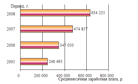 На рис. 12 видно, что среднемесячная заработная плата постоянно увеличивается. И к 2008 г. её количество превысило заработную плату в 2005 г. более чем в 2,5 раза.