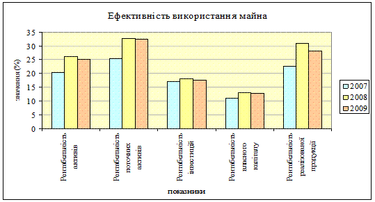Розрахувавши показники рентабельності за 2007–2009 роки ми спостерігаємо їх зростання, і таке збільшення коливається з 2,98% до 28% в середньому за період, що аналізується. Така динаміка свідчить про покращення ефективності використання активів підприємства. Підприємство повинно докладати всіх зусиль, щоб показники рентабельності надалі тільки зростали.