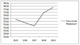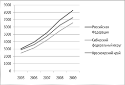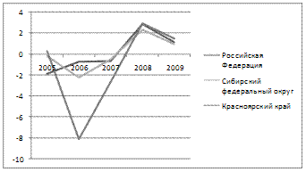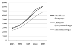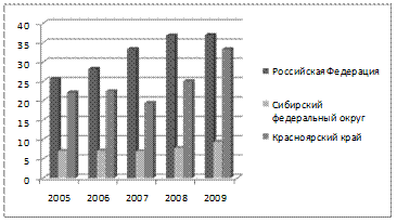 . Спад продолжился до 2007 г. В 2008 и 2009 гг. темпы прироста показателя вышли на положительный уровень, произошла синхронизация темпов изменения в РФ, СФО и Красноярском крае, но в 2009 г. рост земедлился. Тем не менее и в результате показатель 2009 г. превысил значение 2005 г.