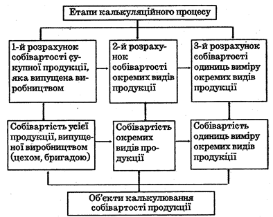 Якщо об'єкт калькуляції собівартість продукції (виробу, послуги або роботи), то калькуляційними одиницями стосовно готової продукції можуть бути сукупна собівартість, тобто собівартість усієї продукції, яку випустило господарство, його виробничий підрозділ (цех, бригада, дільниця тощо); собівартість натуральної одиниці виміру — кількісної (шт. тощо) або якісної (сухі речовини, вологість тощо). Ці одиниці виміру виступають послідовно у калькуляційному. Для того щоб обчислити собівартість окремого виду продукції, потрібно знати собівартість сукупної продукції. Неможливо визначити собівартість натуральної одиниці виміру, якщо попередньо не визначена собівартість окремого виду продукції. Вищенаведене підтверджує те, що калькулювання собівартості продукції — це процес, який складається із трьох послідовних етапів (рис. 7).