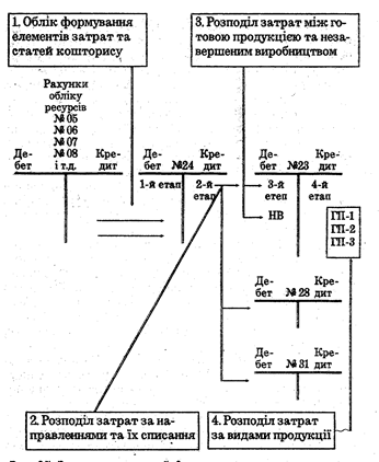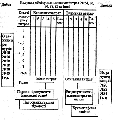 Незважаючи на різні за змістом витрати, ці проміжні комплекси формуються та облікуються за єдиним аналогом. Спочатку затрати у розрізі елементів облікуються покожній статті номенклатури кошторису, виду витрат, а потім на підставі відповідного параметру (ознаки) розподіляються по напрямках. Загальна побудова їх показана на рис. 2.