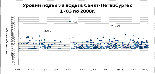 На рис.1.2 приведен график наводнений уровней подъема воды в СПб с 1703 года по 2008 гг..