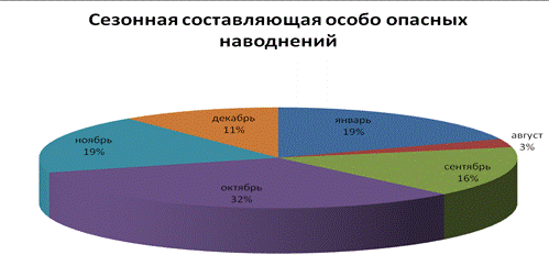 Таким образом, с февраля по июль включительно наводнения почти исключены. Наибольшее количество приходится на октябрь (32%) и наименьшее на август (3%). Этот аспект необходимо учитывать при составлении прогноза.
