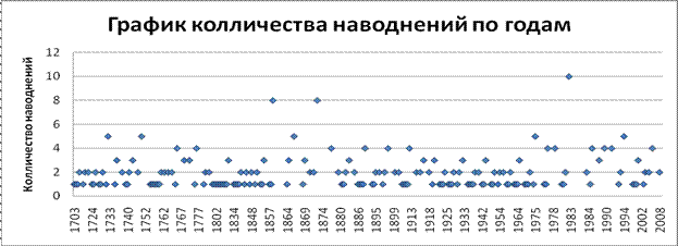 Для исследования наводнений методами математической статистики были использованы данные по наводнениям с 1703 по 2008г., приведенные в Приложении 1.