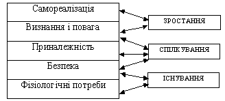 Теорією ERG Клейтона Альдерфера так само як і теорією А.Маслоу стверджується, що потреби людини мають ієрархічну структуру. Проте, в теорії ERG виділені лише три групи потреб робітника (зростання, спілкування та існування) самі потреби та їх співвідношення з пірамідою Маслоу можна спостерігати на Рис.2.