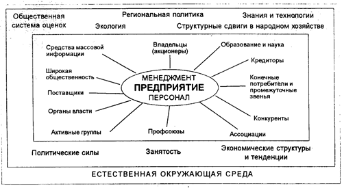 Внешняя среда включает акционеров, потребителей, поставщиков, посредников, конкурентов, рыночную конъюнктуру, финансовые организации, правительственные учреждения и местные органы власти и их политику, население и различные общественные организации, а также законодательную базу, политические, социальные, культурные и многие другие факторы (рис. 1).