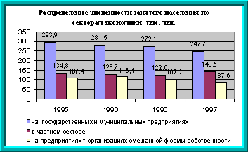 Тюменская область относится к числу регионов РФ с высоким показателем общественной занятости. К началу 1994 г. в народном хозяйстве было занято 96,4% всех трудовых ресурсов. Структурные изменения занятости в материальном производстве и непроизводственной сфере отражают процессы переориентации хозяйственного комплекса района на решение социально-экономических задач. Основную роль в закреплении и создании постоянных кадров играет приоритетное развитие отраслей непроизводственной сферы, для которой характерны более высокие темпы роста численности, чем в отраслях материального производства. С переходом на новые условия хозяйствования проблемы занятости населения осложнятся. Это объясняется сокращением ввода новых рабочих мест, территориальным несоответствием между наличием рабочих мест и свободных.