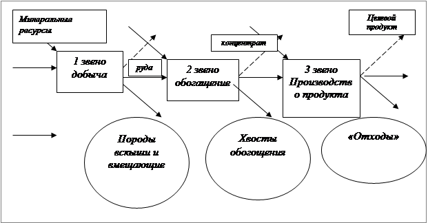 На выходе первого звена (добыча) имеем 5,52 т руды, себестоимость которой равна 7 у.е., а получено 5,52 руды и 2,78 т пород вскрыши, в целом 8.3 т массы. Себестоимость 1 т этой массы составит 55,2:8,3=6,65у.е. Доля удельных, капитальных вложений, приходящаяся на единицу массы равна: 55,2:8,3=6,65 у.е. Приведенные затраты на единицу руды при их долевом распределении не превысят (П=С+Е*к) П=6,65+0,33*6,65=8,8у.е. Реализация отходов (пород вскрыши) по цене не менее приведенных затрат позволит вернуть предприятию 2,78*8,8=24,46 у.е. на каждую тонну чугуна.