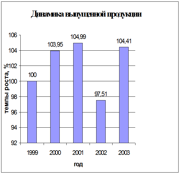 2. Анализ динамики объема производства продукции на 1998-2002 гг. позволил определить среднегодовой темп роста и прироста объема производства, которые составили соответственно 103 % и 3 %. Плановый показатель в 2002 г. был принят с учетом среднего темпа прироста. Плановое выполнение плана составило 44,39 млн. руб.