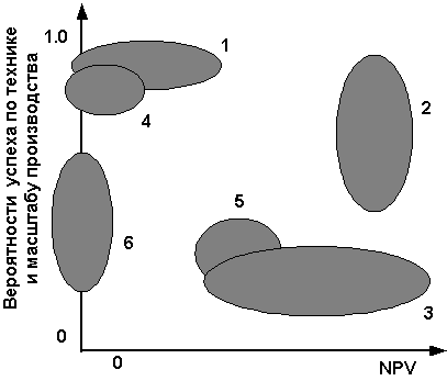 Анализ графиков проектов (рис. 3) дает полезную информацию для решений по организации НИОКР. Например, расположение кластеров эллипсов неопределенности на графике вероятность успеха - чистая текущая стоимость (NPV) совместно с перечнями ключевых факторов, определяющих риск и будущие денежные потоки, и оценками тенденций годовых объемов продаж и необходимых ресурсов для окончания проектов фактически определяют текущие ранговые оценки проектов в портфеле НИОКР фирмы.