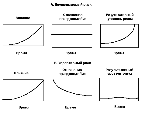 Степень влияния конкретного риска часто зависит от того, что уже проинвестировано к моменту оценки. Если в этом случае будет сделана попытка вернуться назад, то, безусловно, задержится прогресс разработки. Ключом к управлению рисками является контролирование их вероятности появления, которая уменьшается с прогрессом разработки. Риск остается, но управляя им, мы снижаем шансы того, что возможна катастрофа. Эффективно управляемый риск менее разрушителен, чем работа в режиме реакции на его проявление. Характер ситуации при управляемом и неуправляемом рисках отражен на рис. 5.