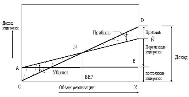 Для каждой конкретной цены продажи единицы конечного продукта линия ОD будет показывать величину доходов при различных объемах продаж. Пересечение линии совокупного дохода с линией совокупных издержек определяет точку безубыточности (Тбезуб) - точку, в которой совокупный доход равен совокупным издержкам (переменным и постоянным). Любая разность по вертикали между линией совокупного дохода и совокупных издержек справа от Тбезуб показывает прибыль при данном объеме производства, в то время как убытки будут показываться на графике слева от Тбезуб, потому как в этом случае совокупные издержки превышают совокупный доход.
