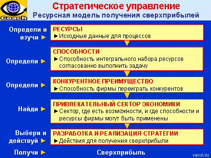Вместо того, чтобы концентрировать усилия на сборе ресурсов, необходимых для реализации стратегии, диктуемой условиями и ограничениями во внешней среде, как рекомендует В\В модель, ресурсная модель утверждает, что уникальные ресурсы и способности фирмы являются основой стратегии. Выбранная стратегия должна позволять фирме наилучшим образом эксплуатировать свои стрежневые компетенции для использования возможностей, возникающих во внешней бизнес среде.