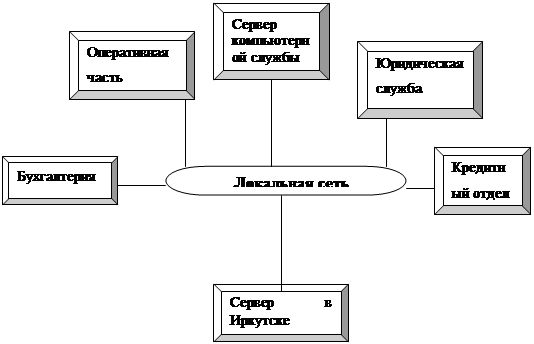 Для связи с центральным управлением системы Транскредитбанк осуществляется при помощи сети Х.25. Для связи с отделениями используется электронная почта. Внутри же банка используется сеть архитектуры Ethernet (топология-звезда). Схема локальной сети представлена на рис. 6.