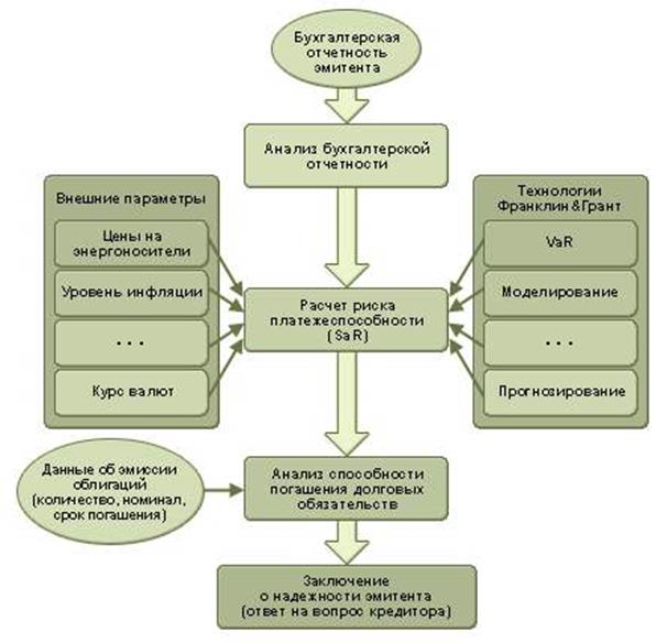 В качестве такой модели можно использовать "Франклин & Грант". Так как "Франклин & Грант" располагает уникальной методикой, в том числе пригодной для развивающихся рынков, позволяющей ответить на вопросы эмитента и кредитора при отсутствии достаточного количества статистических данных о деятельности компании. Основой для расчета риска платежеспособности служит балансовый отчет компании. Балансовый отчет дает возможность оценить коэффициент ликвидности компании. Ликвидность представляет собой отношение стоимости оборотных активов компании и суммы ее краткосрочных долгов. Очевидно, ликвидность зависит от различных внешних параметров - курса валют, цен на энергоносители, состояния фондового рынка и т.д. Моделируя возможные сценарии эволюции этих параметров, можно оценить вероятность того, что ликвидность компании не опустится ниже определенного уровня к планируемому моменту погашения долговых обязательств. Разработанная специалистами "Франклин & Грант" технология носит название SaR (Solvency at Risk) и применима для составления кредитных рейтингов эмитентов.