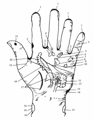 | Рис. 1. Топография рефлексогенных зон на руке человека: