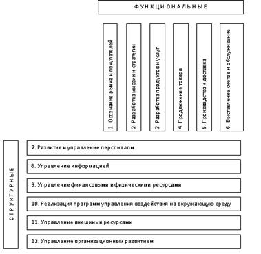 Организация, таким образом, обладает большим количеством способностей, классификация которых становится отдельной задачей. Для упрощения этой задачи можно использовать модель классификации бизнес-процессов, предложенную Американской ассоциацией качества. В соответствии с этой классификацией все бизнес-процессы являются либо функциональными, то есть непосредственно формирующими содержание бизнес-системы и процедуры выполнения своей функции, либо структурными, то есть направленными на поддержание и развитие инфраструктуры бизнес-системы, обеспечивающими собственно существование ее как таковой.