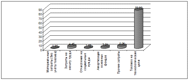 Рассмотрим структуру себестоимости. Наибольший процент составляют затраты на топливо (85,22%). Следующие по себестоимости идут прочие затраты (5,25%).
