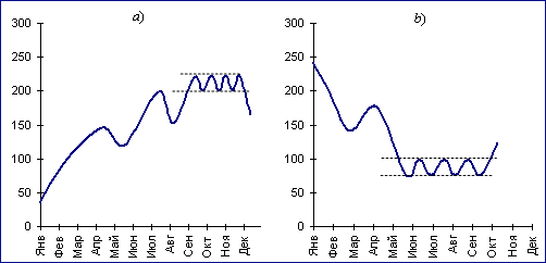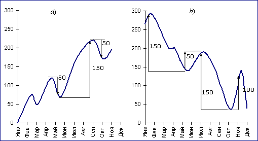 На Рис. 13 даны примеры бычьих трендов, прерываемых вторичными реакциями. На Рис. 13.a индекс имеет по три пика и впадины, каждые из которых располагаются выше предыдущих. Поддержка, следующая за третьим спадом, не достигает уровня предыдущего пика. Далее во время спада индекс опускается ниже предыдущего нижнего уровня, подтверждая в точке Х начало медвежьего периода.На Рис. 13.b, вслед за третьим пиком бычьего рынка падение индекса ниже предыдущей впадины указывает на начало медвежьего рынка. В этом случае предшествующие вторичные изменения относились еще к бычьему рынку, в отличие от впадины в примере на Рис. 13.a, являющейся первой впадиной медвежьего рынка. Многие последователи теории Доу не рассматривают пересечение уровня в точке Х в примере, приведенном на Рис. 13.b, как достаточный показатель начала медвежьего рынка. Они предпочитают придерживаться более осторожной стратегии, дождавшись поддержки и последующего падения индекса ниже указанной впадины, что соответствует точке Y на Рис. 13. b.