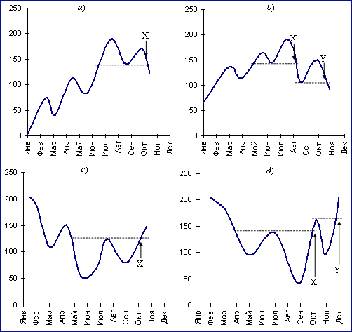 . Теория Доу лишь дает лишь частичную оценку, поэтому использование пяти, шести других индикаторов реагирующих на точки разворота тренда очень полезно, когда решается вопрос, является ли "половинный" сигнал в точке Х признаком разворота тренда. В приведенных на Рис. 13. примерах c и d представлены схожие ситуации на дне медвежьего рынка.