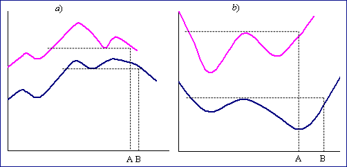 На Рис. 15.a Индустриальный индекс первым сигнализирует о появлении медвежьего тренда (в точке А), но окончательная его фиксация происходит после получения подтверждения от Транспортного индекса в точке B. На Рис. 15.b показано начало нового бычьего периода. После резкого спада промышленность достигает своего очередного низкого уровня, за которым следует поддержка. Следующая реакция не такая сильная, и ее низший уровень находится над предыдущим. Когда цены поднимаются выше уровня предыдущей поддержки в точке A, производство сигнализирует о начале нового бычьего периода. В течение рассматриваемого периода у Транспортного индекса происходит два следующих друг за другом спада. Возникает вопрос, какой из индексов является более точным отражением поведения тренда? Придерживаясь той точки зрения, что следует предполагать сохранение тренда до тех пор, пока разворот не станет явным