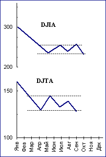 Необходимость подтверждения характера рынка согласованными изменениями обоих индексов (см. Рис. 15) представляется логически вполне обоснованными, поскольку, если фондовый рынок действительно является барометром экономики, то мы вправе ожидать в периоды подъема роста цен предложения как акций компаний, производящих товары, так и акций компаний, эти товары транспортирующих. В здоровой экономике невозможно создание такого положения при котором товары производятся, но не продаются (т.е. перемещаются в рамках рынка).