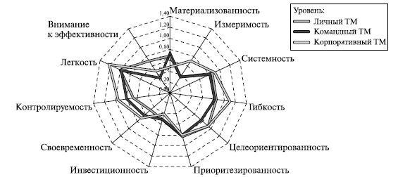Диагностика проводится в форме анкетирования по нескольким ключевым критериям. Результатом является построение ТМ-профиля — простой диаграммы, которая отражает ситуацию в компании или подразделении по всем аспектам тайм-менеджмента (рис. 7.1).