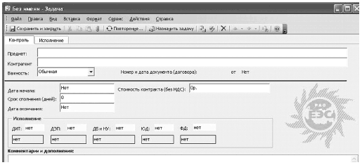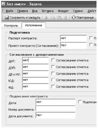 «Одним из направлений работы в проекте внедрения тайм-менеджмента была формализация процесса согласования договоров. Для управления процессом была разработана форма задачи, определяющая основные параметры отслеживаемого договора (рис. 7.4, 7.5). Форма создана без программирования, на базе «штатных» возможностей MS Outlook и содержит две вкладки: «Контроль» (для руководителя, ставящего задачу), и «Исполнение» (для сотрудника, ответственного за проведение договора)».
