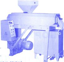 Пресс экструдер предназначен для получения неочищенного масла из сырых семян подсолнечника. Перед загрузкой семян в бункер, они должны быть предварительно подготовлены путём очистки их от механических примесей (камней, почвы, песка и т.п.) и придания им необходимой для ведения технологического процесса влажности. Принцип действия экструдера заключается в измельчении и прессовании семян подсолнечника двумя шнеками с уменьшающимся шагом. Семена загружаются в бункер, откуда самотёком поступают на шнеки. В первой и второй зонах экструдера происходит измельчение и нагрев массы встроенными ТЭНами. В третьей зоне производится предварительное прессование массы в зеерных корзинах, откуда первая порция масла поступает в приёмный лоток. Далее, в четвёртой зоне, продолжается измельчение и перетирание массы с дополнительным нагревом её встроенными ТЭНами. В пятой зоне происходит окончательное прессование массы во второй зеерной корзине с отводом масла в приёмный лоток. Выход отжатой массы осуществляется через матричную планку. Полученное масло стекает в накопительный бак, где происходит фильтрация подсолнечного масла.