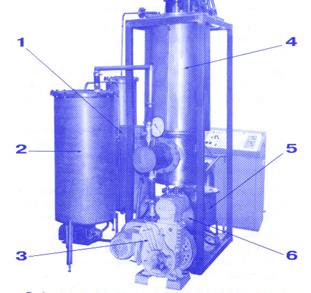 Для работы установки нужна трёхфазная электрическая сеть и проточная холодная вода. Входное масло должно быть предварительно гидратировано и отфильтровано от механических примесей. Масло из ёмкости 1 для исходного продукта поступает в деаэрационно-сушильный агрегат 2, в котором с использованием вакуумного насоса 3 удаляется избыточная влага. Далее масло попадает в дезодорационную колонну 4, где и происходит процесс дезодорации и рафинации. Дезодорация и рафинация происходит без применения всяких химических препаратов (таких как щёлочь). Из колонны масло перекачивается в ёмкость 5 для готового продукта. Отходы, составляющие 3-5% в исходном продукте, в спиваются в другую ёмкость 6 и могут быть использованы в мыловаренном и парфюмерном производстве.