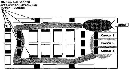 Большое внимание в торговом предприятии следует уделять размещению товаров импульсивного спроса. Наиболее правильным считается размещение их в самых "проходных" местах зала: у входа и выхода, в прикассовой зоне, на так называемых гондолах - специальных стеллажах в торцовой части торгового ряда. Способен увеличить объем продаж и такой прием, как дублирование товара. Например, организовав фирменный уголок товара, его же можно разместить у кассы.