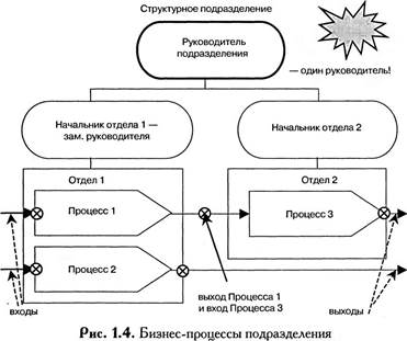 (Отдел 2 на рис. 1.4). У руководителя подразделения могут быть заместители — начальники отделов (Отдел 1), которые так же могут являться владельцами процессов более низкого уровня. В подразделение поступает информация и материалы. Они преобразуются процессами подразделения в результаты (выходы), потребляемые внутренними и внешними клиентами. Руководитель подразделения и его заместители управляют процессами подразделения и обеспечивают их результативность и эффективность.