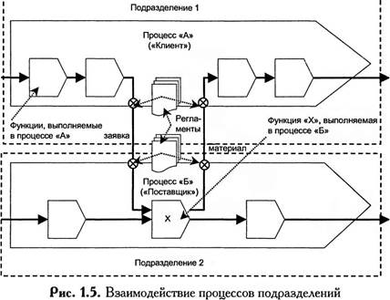 которые также выполняют определенные процессы, как показано на рисунке 1.5. Процесс «Б» Подразделения 2 является поставщиком процесса «А». Определяются границы процессов по входам и выходам, регламентируются требования по входам/ выходам. Таким образом, деятельность внутри каждого подразделения можно четко структурировать