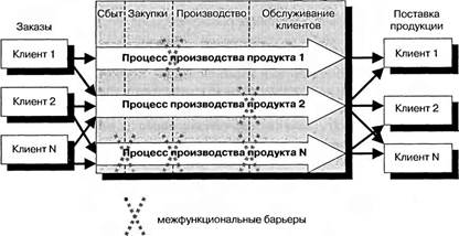 Выделение межфункциональных процессов по может быть выполнено в том случае, если каждый клиент потребляет уникальный продукт, создание продуктов ведется параллельно, и при этом процессы слабо пересекаются друг с другом.