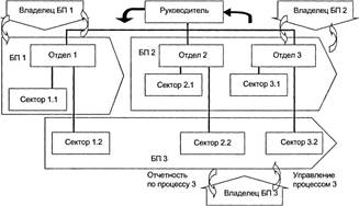 Чаще встречается ситуация, когда процессы, выделенные по продуктовой цепочке, пересекаются в одном из подразделений организации (рис. 8).