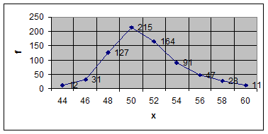 . Для его построения в прямоугольной системе координат по оси абсцисс в одинаковом масштабе откладываются ранжированные (упорядоченные) значения варьирующего признака, а по оси ординат наносится шкала для выражения частот.