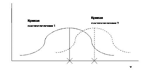 На данном рисунки кривые распределения 1 и 2 имеют одинаковый размах вариации и характер распределения частот, но отличаются величиной варьирующего признака, являющегося центром группирования (это отмечено на оси Х).Характеристики центра группирования составляют одну из групп обобщающих показателей. В качестве них используют среднюю арифметическую, медиану и моду.