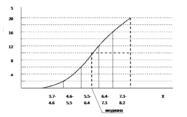 При построении кумуляты интервального ряда распределения нижней границе первого интервала соответствует частота, равная нулю, а верхней границе – вся частота данного интервала. Верхней границе второго интервала соответствует накопленная частота, равная сумме частот первых двух интервалов, и т.д.