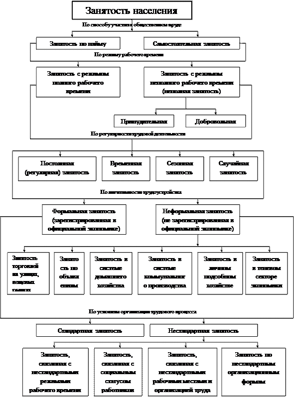 Существуют теоретическая и практическая трактовки занятости. Теоретически занятость - это общественно полезная деятельность граждан, связанная с удовлетворением личных и общественных потребностей и приносящая, как правило, заработок или трудовой доход. Практически занятость - это соотношение между числом трудоспособного населения и числом занятых, характеризующее степень использования трудовых ресурсов общества и ситуацию на рынке труда. Однако обе трактовки не учитывают глубинные процессы, свойственные занятости. Занятость имеет ярко выраженный социальный характер. Она отражает потребность людей не только в доходах, но и в самовыражении посредством общественно полезной деятельности, а также степень удовлетворения этой потребности при определенном уровне социально-экономического развития общества.
