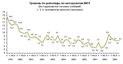 Важнейшим показателем состояния рынка труда является уровень безработицы. Единственный фактор, сдерживающий рост безработицы с точки зрения динамических потоков на рынке труда - существенное увеличение доли безработных, перешедших в состав экономически неактивного населения (например, женщины – заняты ведением домашнего хозяйства).