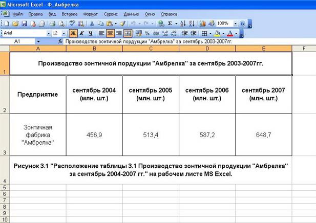 Зонтичная фабрика "Амбрелка" за 2004-2007гг., млн. шт. (табл. 3.1):
